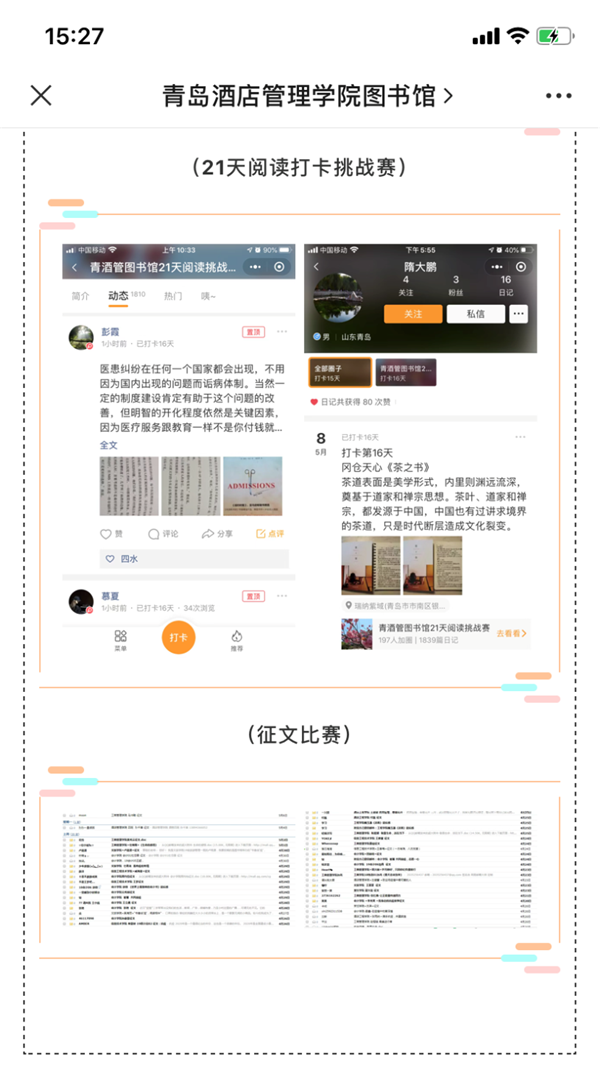 各總支、支部把讀書活動作為主題黨日活動的重要內容,創新思維,豐富形式,借助各種介質及新媒體平臺,通過線上線下相結合的方式,積極組織開展讀書沙龍、讀書分享會、領讀人等豐富多彩的系列活動,打造了“紅燭讀書會”“讀書片刻”等閱讀品牌,力求把讀書活動激發出來的學習熱情轉化為推動工作的干勁,實現學習成果的轉化。學院圖書館開展了“莫負春光好時節 閱讀學習正當時”為主題的讀書月系列活動,依托“21天閱讀打卡挑戰賽”“書香戰‘疫’,閱讀相伴”征文比賽、線上朗讀比賽等活動,充分發揮線上資源、平臺的優勢,通過開展各類閱讀推廣活動,提升師生的人文素養。