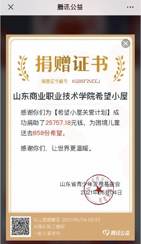 除此之外,山東商院積極響應(yīng)團(tuán)省委號(hào)召,聯(lián)合各二級(jí)學(xué)院開展了騰訊公益線上募捐活動(dòng),活動(dòng)自開展以來得到了全校廣大青年學(xué)生的大力支持,大家紛紛獻(xiàn)出愛心,共籌得善款13592元。截至目前,線上線下共籌得善款25757元,均已捐贈(zèng)給山東省青少年發(fā)展基金會(huì)。