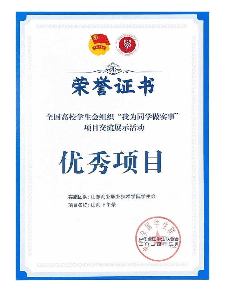 3月24日,由共青團中央指導(dǎo),全國學(xué)聯(lián)主辦的全國高校學(xué)生會組織“我為同學(xué)做實事”項目交流展示活動圓滿閉幕,山東商職學(xué)院申報的“山商下午茶”被評為交流展示活動“優(yōu)秀項目”。