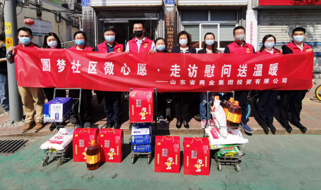 “五一”和“五四”雙節(jié)來(lái)臨之際,為充分展現(xiàn)青年志愿者的風(fēng)采,精準(zhǔn)服務(wù)社區(qū),做實(shí)做新做優(yōu)“雙報(bào)到”工作,進(jìn)一步實(shí)現(xiàn)共駐共建共享的目標(biāo),近日,山東省商業(yè)集團(tuán)投資有限公司(以下簡(jiǎn)稱(chēng)投資公司)聯(lián)合山師東路社區(qū),開(kāi)展“圓夢(mèng)社區(qū)微心愿·走訪慰問(wèn)送溫暖”主題黨日活動(dòng)。山師東路社區(qū)黨委書(shū)記顧海霞、黨委副書(shū)記周虹,投資公司總部黨支部書(shū)記奚楚,永興物業(yè)黨支部書(shū)記李濤參加活動(dòng)。