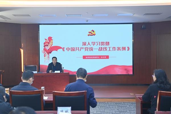 11月11日,山東商院舉行黨委理論學習中心組(擴大)學習會,深入學習貫徹《中國共產(chǎn)黨統(tǒng)一戰(zhàn)線工作條例》(以下簡稱《條例》),省委統(tǒng)戰(zhàn)部副部長孫中亮作專題輔導報告。