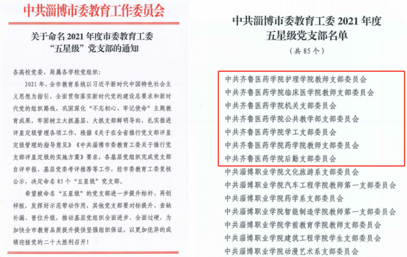 近日,淄博市委教育工委發(fā)布《關(guān)于命名2021年度市教育工委“五星級(jí)”黨支部的通知》,齊魯醫(yī)藥學(xué)院護(hù)理學(xué)院教師黨支部、臨床醫(yī)學(xué)院教師黨支部、機(jī)關(guān)黨支部、公共教學(xué)部黨支部、學(xué)工黨支部、藥學(xué)院教師黨支部、后勤黨支部7個(gè)黨支部獲評(píng)“五星級(jí)”黨支部。