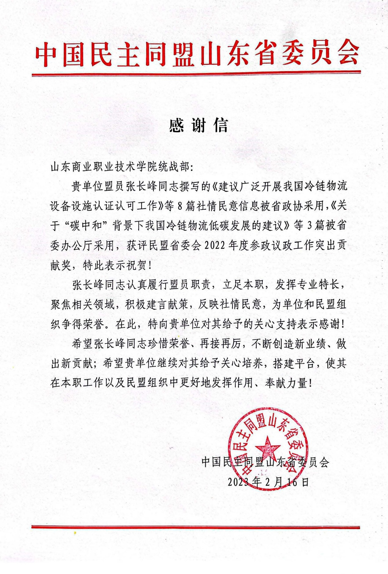 近日,民盟山東省委向山東商院發(fā)來感謝信,對學校給予民盟山東省委委員、民盟山東商院支部主委張長峰的關心支持表示感謝,對張長峰獲評“民盟省委會2022年度參政議政工作突出貢獻獎”表示祝賀。