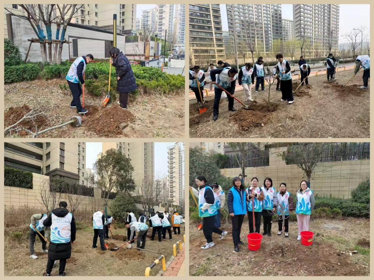 在植樹現(xiàn)場,大家揮鍬鏟土、扶樹培土、提水澆灌,認真完成每一道工序,合力將一棵棵樹苗種下。經過一番忙碌,10棵海棠樹苗迎著春風挺立,為這片空地增添了勃勃生機。