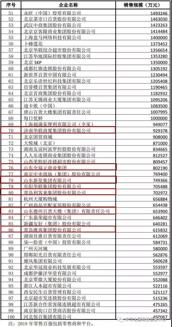 2018年,天貓和京東分別以2.45萬億和1.68萬億的銷售規(guī)模領跑零售百強,拼多多同比增速234.0%,躋身百強第三名。本次零售百強榜單中,山東共有11家企業(yè)入圍。