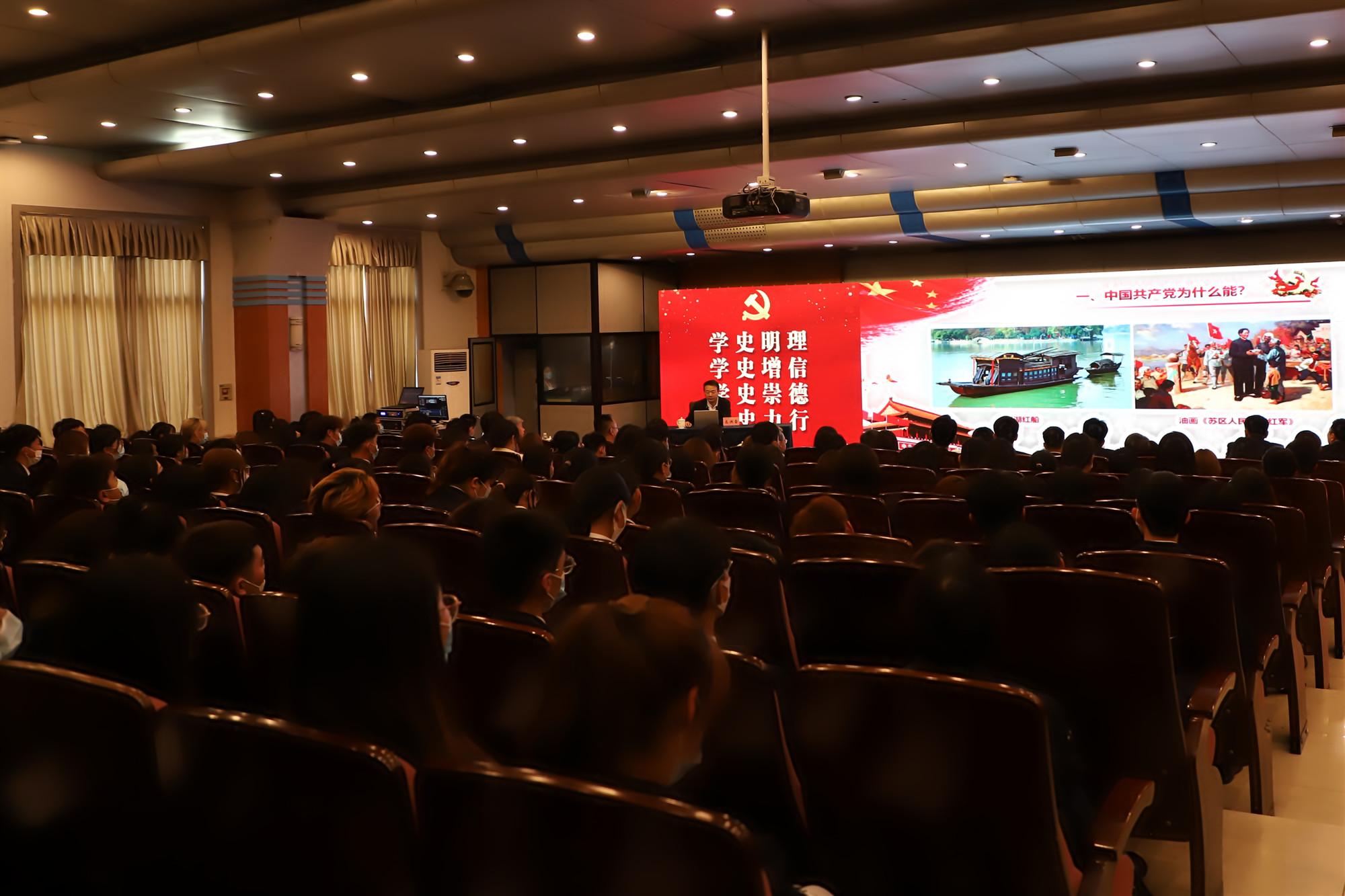 高洪雷結合黨史故事,通過重大事件、重要人物回顧了中國共產黨百年奮斗的光輝歷程和歷史性貢獻,詮釋了共產黨人的革命理想和初心使命。他表示,一要弄清楚中國共產黨為什么“能”。二要弄清楚中國特色社會主義為什么“好”。歷史和實踐證明,只有社會主義才能救中國,只有中國特色社會主義才能發展中國。三要弄清楚“為什么講團結統一”。增強“四個意識”,堅定“四個自信”,做到“兩個維護”,是我們黨和國家從勝利走向勝利的重要保證。四要弄清楚“為什么要保持純潔”。要擰緊總開關,劃好人生底線,做到慎獨、慎初。五要弄清楚“為什么要有精神”。人有了精神,就有了追求,有了動力,有了靈魂,有了脊梁骨,就有骨氣、志氣、勇氣;沒有精神,就沒有追求,就會失去動力,就等于得了軟骨病,缺什么都不能缺精神。