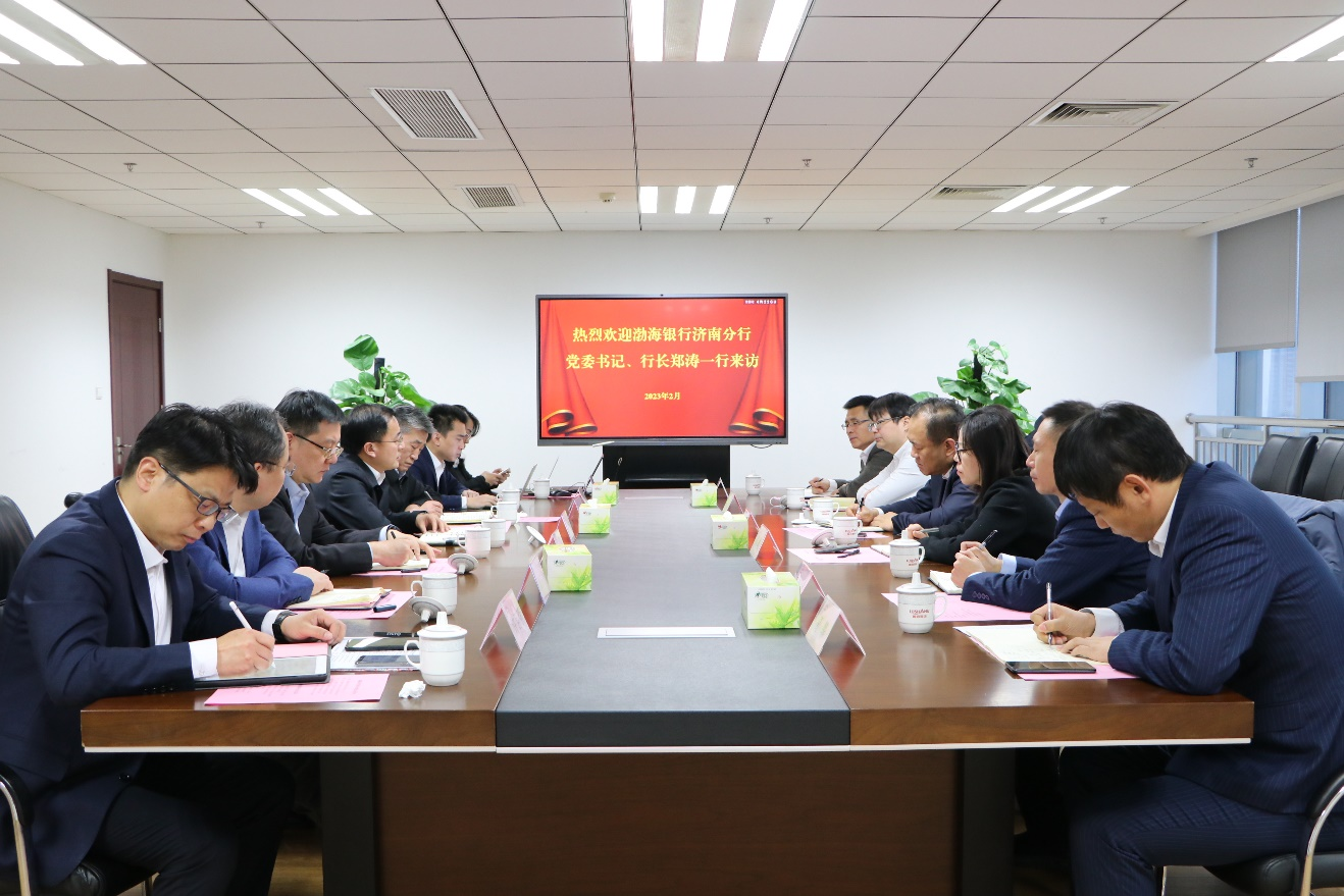 2月15日,渤海銀行濟南分行黨委書記、行長鄭濤到訪魯商集團,集團黨委副書記、董事、副總經(jīng)理朱華建熱情接待。