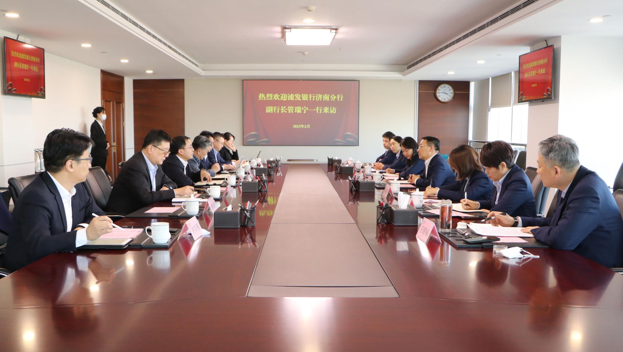 2月20日,浦發銀行濟南分行副行長管瑞寧到訪魯商集團,集團黨委副書記、董事、副總經理朱華建熱情接待并組織座談。