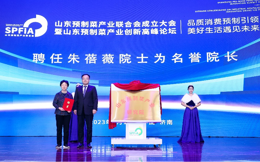 在隨后舉行的山東預制菜產業高峰論壇上,朱蓓薇、王緒超共同為山東預制菜產業研究院揭牌,王緒超向朱蓓薇頒發山東預制菜產業研究院名譽院長聘書。