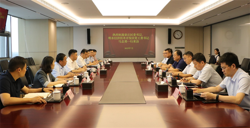 7月12日,章丘區委書記、明水經濟技術開發區黨工委書記馬志勇到訪魯商集團,集團黨委書記、董事長王緒超熱情接待并舉行座談,黨委副書記、董事、副總經理朱華建,明水經濟技術開發區黨工委副書記、管委會主任黃波,章丘區委常委、副區長黃凱東出席活動。