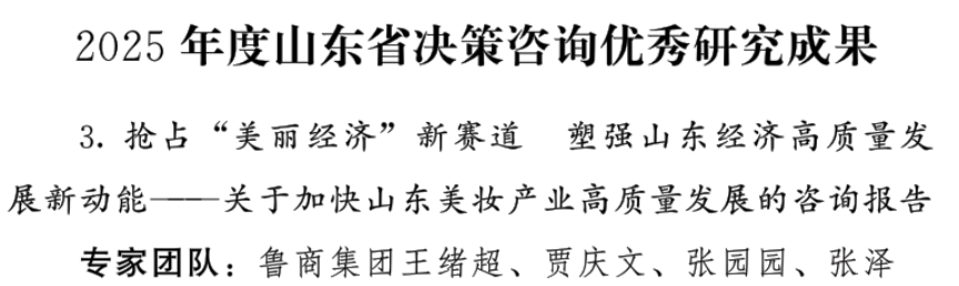 近日,山東省決策咨詢委員會發(fā)布《關于表揚2025年度山東省決策咨詢優(yōu)秀研究成果的通報》,對全省12項高質量決策咨詢優(yōu)秀研究成果予以通報表揚。由魯商集團撰寫的研究報告《搶占“美麗經濟”新賽道 塑強山東經濟高質量發(fā)展新動能——關于加快山東美妝產業(yè)高質量發(fā)展的咨詢報告》成功入選,榮獲省級表彰。