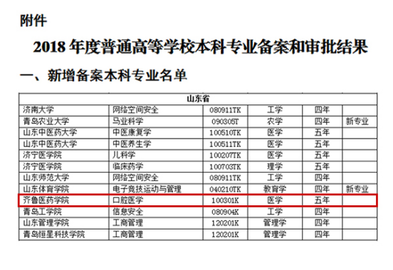 近日,教育部公布了2018年度普通高等學(xué)校本科專業(yè)備案和審批結(jié)果,齊魯醫(yī)藥學(xué)院申報的口腔醫(yī)學(xué)(五年制、醫(yī)學(xué)學(xué)位)本科專業(yè)獲批設(shè)置。