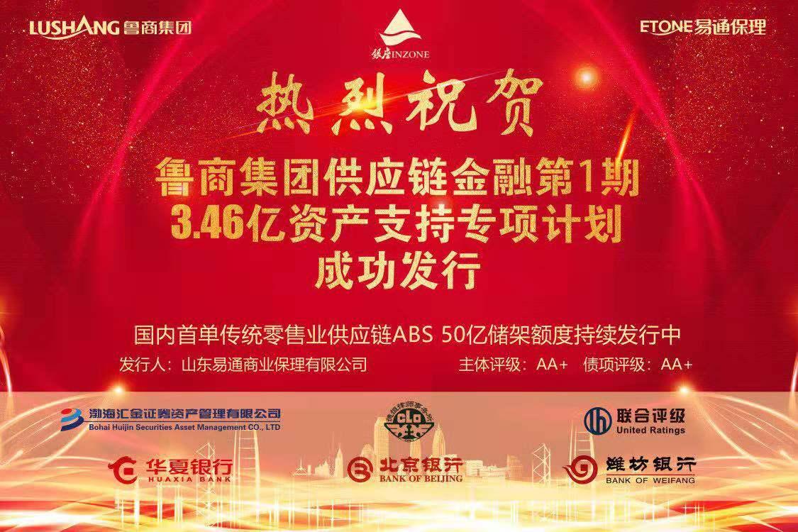 6月6日,省商業集團有限公司(以下簡稱魯商集團)供應鏈金融資產支持專項計劃第一期在上海交易所成功發行。本期發行規模3.46億元,債項評級AA+,產品期限一年。
