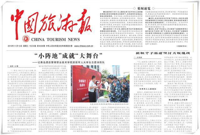 11月13日,《中國旅游報》在第四版以《“小陣地”成就“大舞臺”——記青島酒店管理職業(yè)技術學院退役軍人大學生志愿消防隊》為題,大篇幅報道了學院積極響應《關于做好全省退役士兵安置和權益保障工作的意見》等文件精神,多元施策,著力耕耘“小陣地”,搭建“大舞臺”,努力為退役軍人大學生們提供優(yōu)質載體,切實取得良好實效的情況。全文如下: