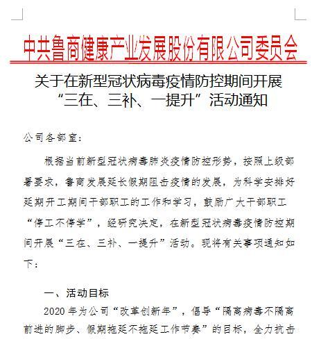 根據(jù)當(dāng)前新型冠狀病毒肺炎疫情防控形勢,魯商健康產(chǎn)業(yè)發(fā)展股份有限公司(簡稱魯商發(fā)展)黨委按照上級(jí)統(tǒng)一部署延長假期阻擊疫情。為科學(xué)安排好延期開工期間干部職工的工作和學(xué)習(xí),鼓勵(lì)廣大干部職工“停工不停學(xué)”,面向全體職工在疫情防控期間開展“三在三補(bǔ)一提升”活動(dòng)。