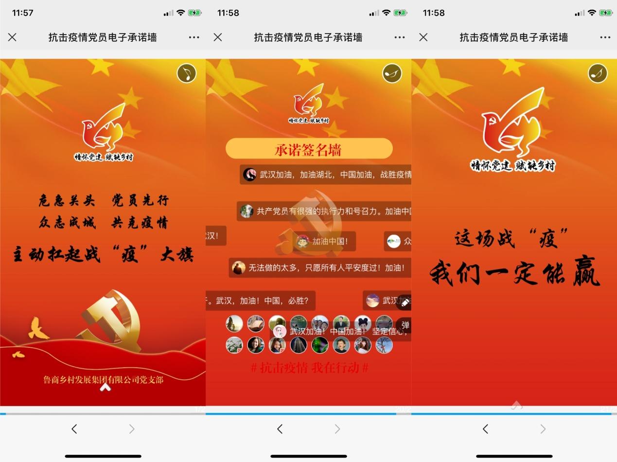 學習采取線上集中學習和線下自學相結合的方式,各黨小組召開視頻會議、進行線上交流,根據實際工作談個人體會;同時通過學習強國、微信、釘釘等平臺自學。大家根據所學所感,并以一句話說出對抗疫工作及集團工作的信心決心和承諾。“疫情無情人有情,魯商國企顯擔當,全體職工跟黨走,眾志成城勝‘疫戰’”“學擔當,優秀黨員樹楷模;看行動,魯商集團作表率。”一句句鏗鏘誓言展現了全體黨員積極應對疫情、做好防范工作、堅決打贏“戰疫”的信心和決心。承諾墻以H5的形式傳閱,引起強烈反響。