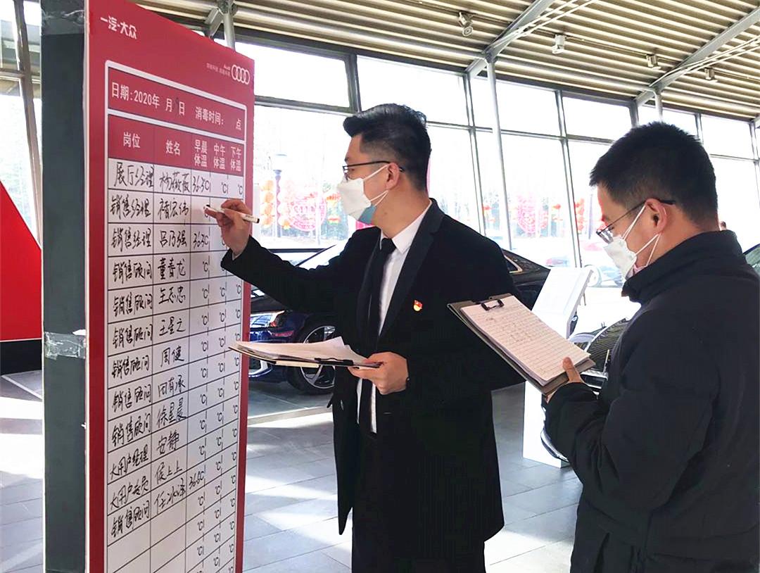 疫情防控,宣傳先行。新冠肺炎疫情發生以來,銀座汽車奧迪4S店市場經理劉林帶頭傳遞正能量,利用遠程電話會議開展疫情防控培訓,從疫情形勢到防控要求,從核心業務場景到防疫日常管理,全方位、多角度進行了系統講解,加快了一線工作人員對防控工作的認知和掌握。為給客戶提供一個放心安心舒心的看車環境,他超前謀劃,確定了防疫宣傳物料的設計方案,每一輛展車都懸掛了“車輛已消毒”的標識牌,每一個洽談桌都擺放了“此區域已消毒”的提示牌,還制作了工作人員體溫公示牌等,有效筑起基層“防護網”,打通疫情防控宣傳的“最后一米”。