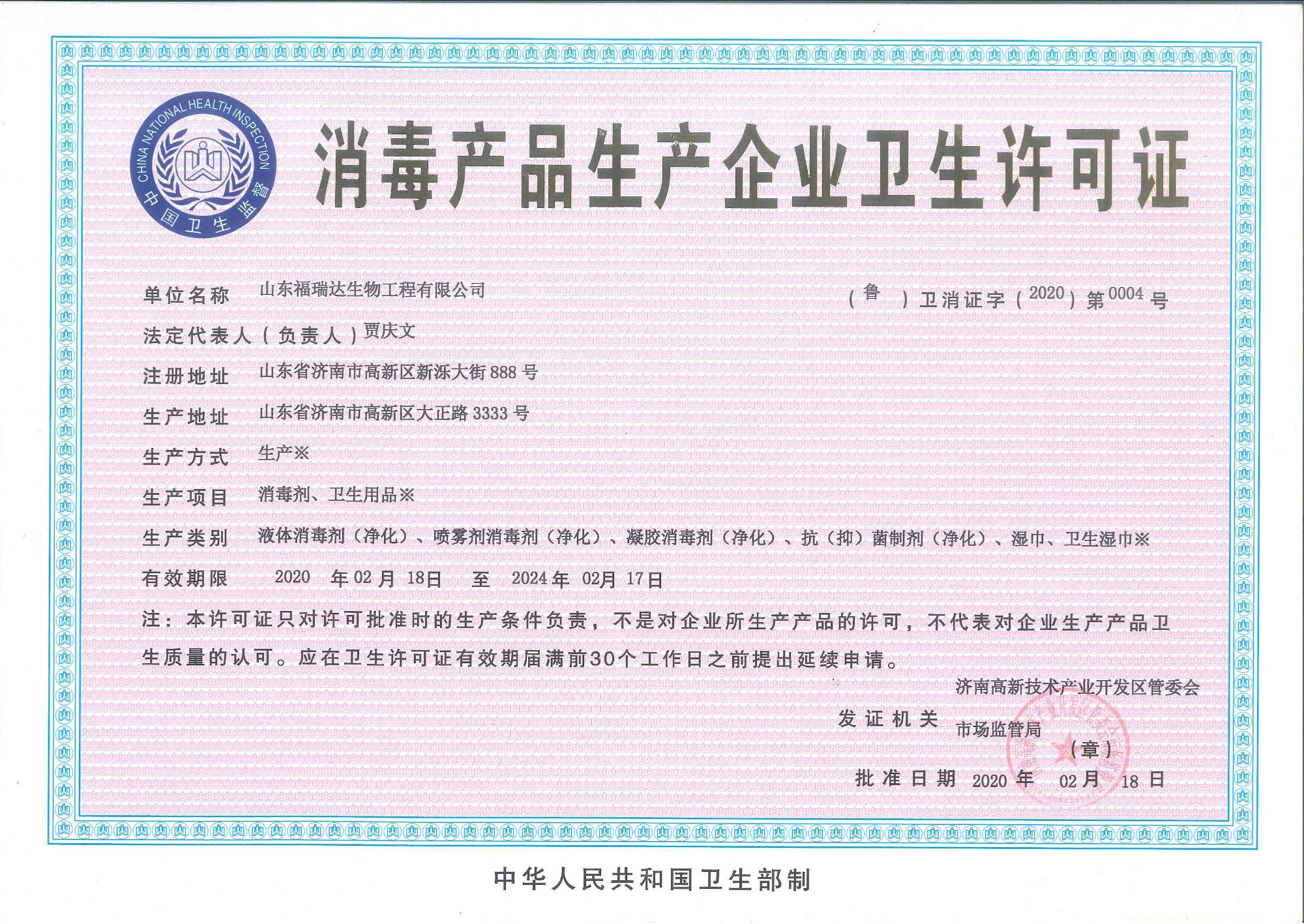 自新冠肺炎疫情暴發(fā)以來,疫情的變化每天都牽動人心,面對即將到來的返工潮、開學潮,各類消毒防護產(chǎn)品緊缺,為此政府相關(guān)部門對此類產(chǎn)品開通綠色審批通道給予政策支持。山東福瑞達醫(yī)藥集團有限公司(簡稱福瑞達)旗下山東福瑞達生物工程有限公司(以下簡稱“福瑞達美業(yè)”)快速反應,于2月18日成功取得《消毒產(chǎn)品生產(chǎn)企業(yè)衛(wèi)生許可證》。