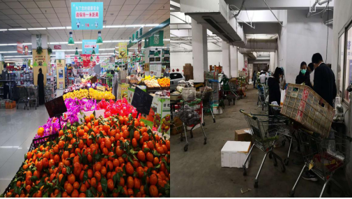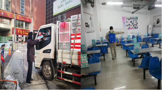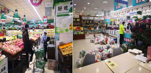 早上8:00,物業(yè)部同事開始了營業(yè)前消殺工作,對賣場、辦公區(qū)的購物車、生鮮柜臺、收銀臺、地面、門把手、加工間、衛(wèi)生間、餐廳、垃圾桶、更衣室等進(jìn)行全面消毒滅菌處理。蔬菜配貨車到達(dá),為配貨司機測溫、登記、消毒,在停車場外完成第一道檢測。