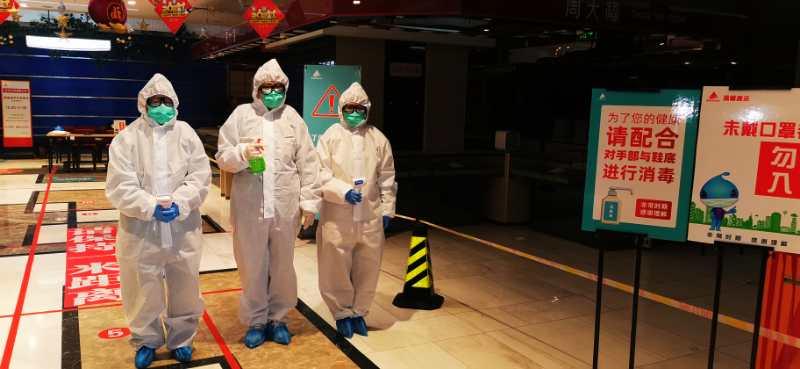 體溫測量處、收銀臺的“女漢子”們整裝待發(fā),防護服、護目鏡、手套、帽子、鞋套、口罩,互相檢查防護裝備。顧客登記本、消毒酒精、手部消毒液、測溫槍、備用口罩一樣不能少。