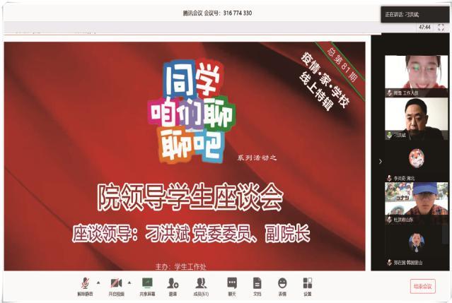 座談會上,學院副院長刁洪斌向來自18個省、市、自治區(qū)的52名學生同學們表達了問候,并特別詢問了參加座談的5名湖北籍學生的具體情況。隨后,他就學生們關心的開學時間、開學后的課程安排、疫情期間的頂崗實習、學院的防控措施等問題進行了詳細解答,并與學生連線,“屏對屏,面對面”,聽取了關于線上教學、補課安排、學生活動、快件管理、實習就業(yè)等問題的意見和建議。刁洪斌感謝同學們?yōu)閷W校提出的寶貴意見和建議,表示會后將認真論證并向相關負責人反應,討論下一步的調(diào)整或改進措施。最后,他希望同學們“嚴格自律,做好居家學習和生活,過好每一天,九水東路599號隨時準備迎接同學們平安歸來”。