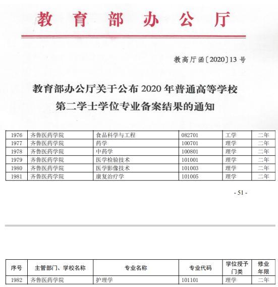 近日,從教育部辦公廳《關(guān)于公布2020年普通高等學校第二學士學位專業(yè)備案結(jié)果的通知》(教高廳函〔2020〕13號)文件獲悉,齊魯醫(yī)藥學院申報的藥學、中藥學、食品科學與工程、醫(yī)學檢驗技術(shù)、醫(yī)學影像技術(shù)、康復治療學、護理學等7個第二學士學位專業(yè)順利通過評審,增列為學院第二學士學位備案專業(yè)。