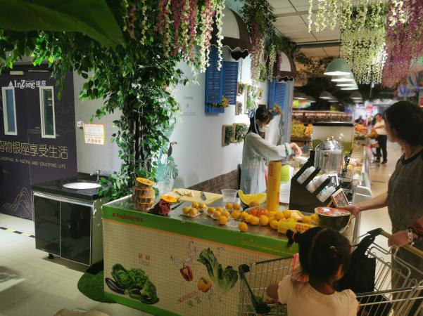 進入超市,首先映入眼簾的是用大樹、藤條、草坪裝飾的“鮮營小鎮”,配搭婉轉的鳥鳴聲背景音效,讓人仿佛置身于森林公園。造型獨特的生鮮推頭與現場環境融為一體,完美地將產品展示出來,提升了顧客的購買欲。日配區“美食坊”,以古色古香的鏤空式窗格進行裝飾,旁邊設有古亭風格的休息就餐區,與古運河文化相結合,喚醒人們的城市記憶。特色鮮明的裝修風格吸引不少年輕人駐足,打卡拍照,大家紛紛表示,這樣購物就像在逛公園,真的想多來幾次。