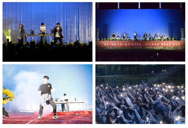 9月30日晚19:00,隨著架子鼓的一聲震動,2020年首屆“魯醫熱浪”音樂節正式開始。竇房結樂隊、氟西汀樂隊、校音樂社伴隨陣陣歡呼聲輪番上場,唱出青春激情與活力;DJ穿插精彩紛呈的舞蹈引爆眾多觀眾的激情,炫酷的搖滾,華麗的燈光,躁動的音樂,將整場音樂節推向極致。演出現場激情四射,觀眾跟著音樂節奏揮舞著手中的熒光棒,掌聲歡呼聲此起彼,學生會QQ公眾號為博山校區的同學進行了現場直播,直播觀看人數達2000人,點贊10000余次,直播評論區,熱鬧非凡,紛紛為今夜首屆“魯醫熱浪”音樂節打call。
