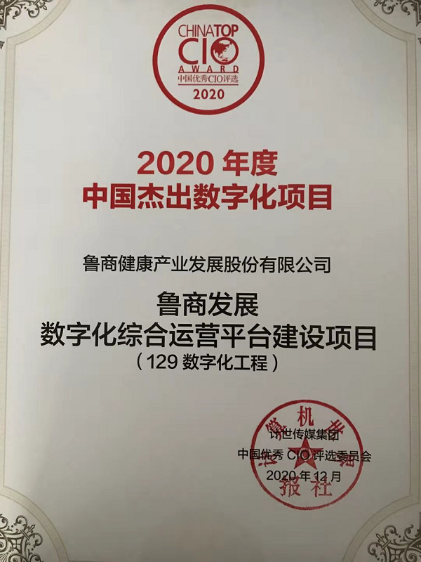 12月19日,“中國CIO高峰論壇暨2020年度中國優(yōu)秀CIO頒獎典禮”在北京舉行。魯商發(fā)展數(shù)字化綜合運營平臺建設(shè)項目(簡稱129工程)榮獲“2020年度中國杰出數(shù)字化項目”獎,魯商發(fā)展首席信息官董勤林榮獲“2020年度中國杰出CIO TOP5”稱號。