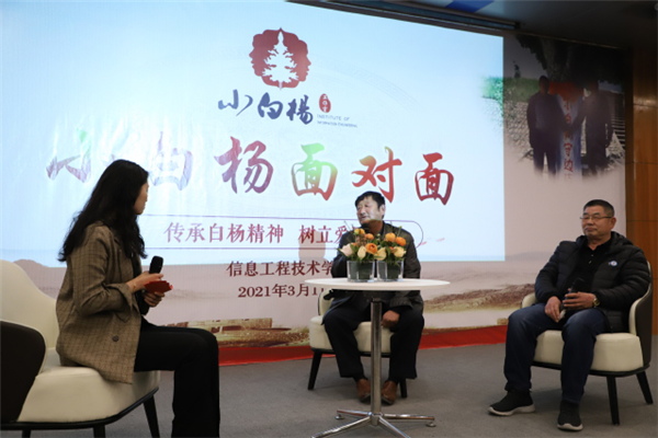 程富勝在學術報告廳為信息工程技術學院全體師生講述了“小白楊”背后的故事。他表示:“軍旅曲目《小白楊》家喻戶曉、經典傳唱,‘小白楊精神’不僅是軍人戍邊、保衛國家的精神所系,更是激勵一代代青年人扎根祖國最需要的地方、傲立挺拔、報效祖國的精神動力。”