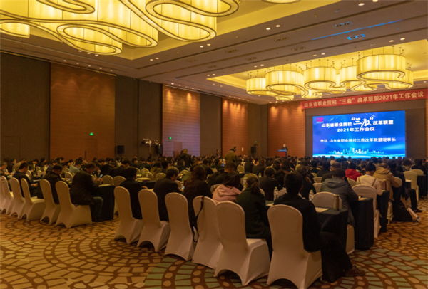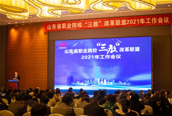學院院長姜玉鵬主持會議開幕式。山東省教育廳職教處副處長趙朝暉在講話中對山東省職業(yè)院?!叭獭备母锫撁?021年工作會議的召開表示祝賀,分析了職業(yè)教育發(fā)展形勢,闡釋了2021年山東省職業(yè)教育工作重點。他要求,各聯盟單位要深入學習貫徹習近平總書記對職業(yè)教育工作作出的重要指示,落實李克強總理批示要求,創(chuàng)造新實踐、探索新經驗、蹚出新路子,切實做好“三教”改革各項工作,為部省共建職教高地貢獻智慧和力量。