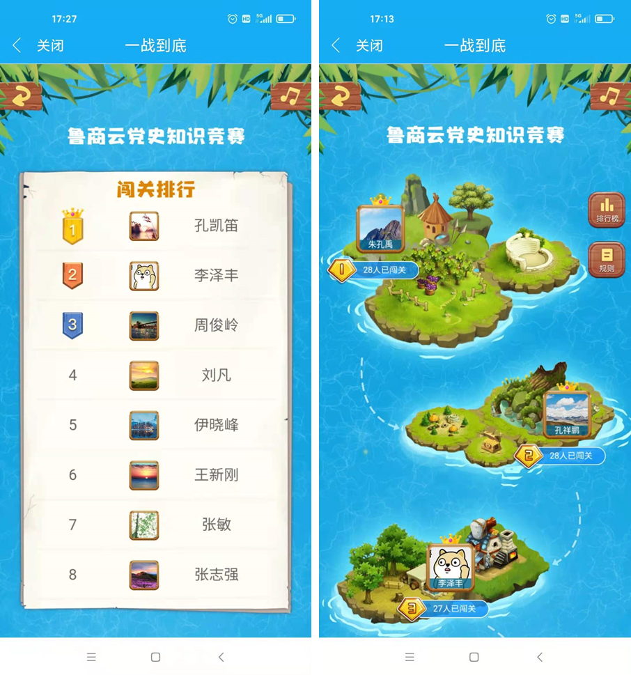 此次黨史知識(shí)競(jìng)賽是中心黨史學(xué)習(xí)教育“七個(gè)一”系列活動(dòng)的“共賽一次黨史”模塊,競(jìng)賽充分利用集團(tuán)在線學(xué)習(xí)平臺(tái)的強(qiáng)大功能,采用游戲化闖關(guān)模式開展,根據(jù)答題難易程度,全程共設(shè)置十個(gè)關(guān)卡,系統(tǒng)按照闖關(guān)數(shù)量、速度、正確率自動(dòng)實(shí)時(shí)排名。中心全體員工通過手機(jī)在線參與競(jìng)賽活動(dòng),過五關(guān)、斬六將,最后李澤豐、孔凱笛、周峻嶺獲得競(jìng)賽前三名并贏得書券獎(jiǎng)勵(lì)。