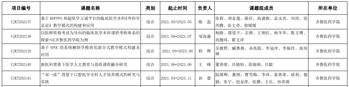 近日,省高等醫(yī)學(xué)教育研究中心發(fā)布《關(guān)于公布2021年山東省高等醫(yī)學(xué)教育研究中心科研規(guī)劃課題的通知》,齊魯醫(yī)藥學(xué)院獲批立項(xiàng)5項(xiàng)課題,分別為《基于BOPPPS和超星學(xué)習(xí)通平臺(tái)的臨床醫(yī)學(xué)本科<外科學(xué)總論>教學(xué)模式的構(gòu)建和應(yīng)用》《以醫(yī)師資格考試為導(dǎo)向的臨床醫(yī)學(xué)本科課程考核體系的探索——以齊魯醫(yī)藥學(xué)院為例》《基于SPOC的系統(tǒng)解剖學(xué)模塊化混合式教學(xué)模式構(gòu)建及應(yīng)用》《新醫(yī)科背景下醫(yī)學(xué)人文教育與思政課程融合研究》《“雙一流”背景下口腔醫(yī)學(xué)全科人才培養(yǎng)模式的研究與實(shí)踐》。