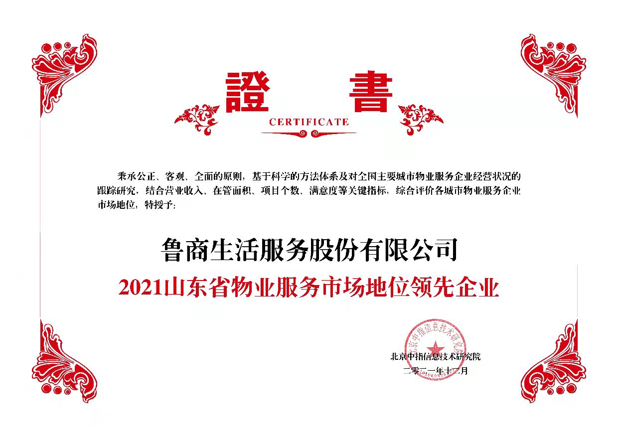 12月2日,由北京中指信息技術(shù)研究院主辦,中國(guó)房地產(chǎn)指數(shù)系統(tǒng)、中國(guó)物業(yè)服務(wù)指數(shù)系統(tǒng)承辦的“2021中國(guó)房地產(chǎn)大數(shù)據(jù)年會(huì)暨2022中國(guó)房地產(chǎn)市場(chǎng)趨勢(shì)報(bào)告會(huì)”召開(kāi)。魯商服務(wù)憑借創(chuàng)新的服務(wù)文化和優(yōu)秀的服務(wù)品質(zhì)榮獲“2021山東省物業(yè)服務(wù)市場(chǎng)地位領(lǐng)先企業(yè)”榮譽(yù)稱(chēng)號(hào)。