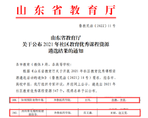 近日,省教育廳公布2021年社區(qū)教育優(yōu)秀課程資源遴選結果,齊魯醫(yī)藥學院《如何預防食物中毒》《內(nèi)科常見慢性病健康指導》2門課程被評為優(yōu)秀課程資源。省教育廳擬將其推介到國家終身教育智慧教育平臺。