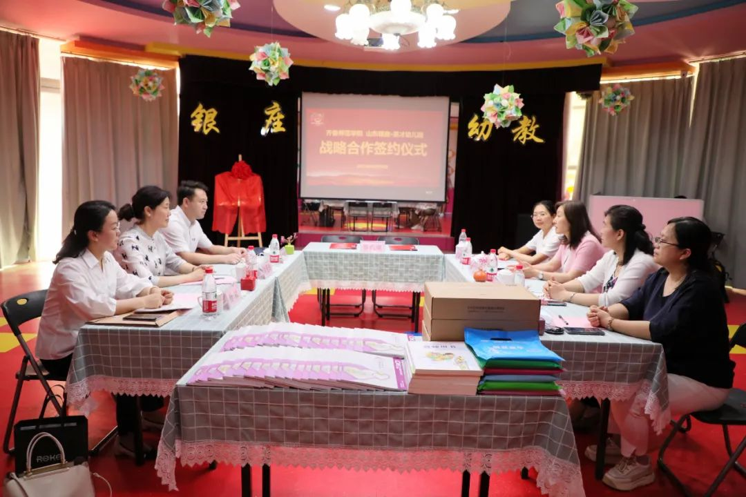 張麗與常愛玲代表雙方簽署戰略合作協議。袁霞與常愛玲共同為齊魯師范學院教學實踐基地、齊魯師范學院學前教育學院實習實踐基地揭牌。