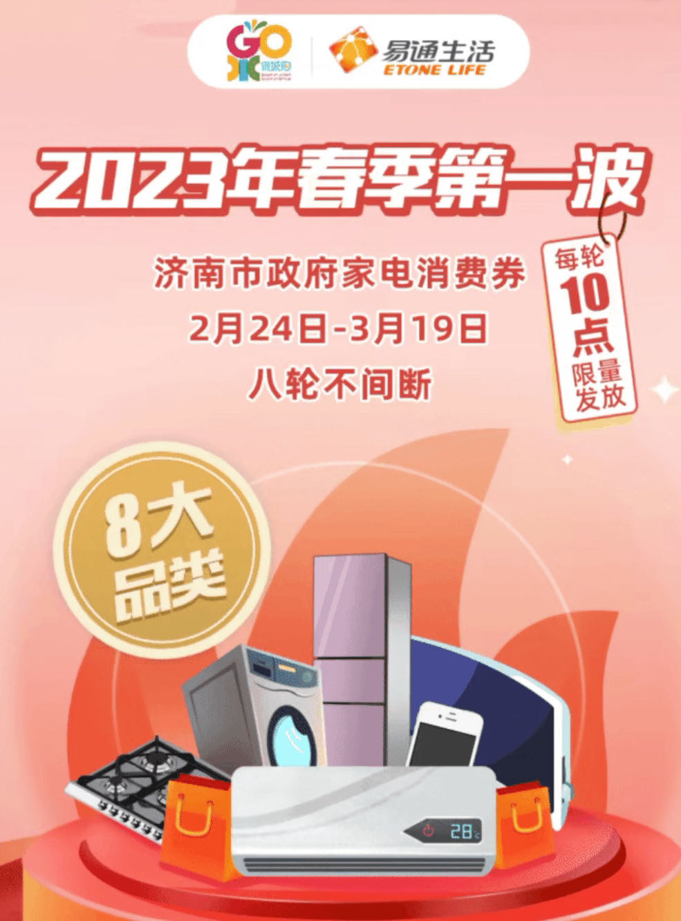 易通金服發(fā)揮數(shù)字化科技優(yōu)勢(shì),成功入圍濟(jì)南市商務(wù)局2023-2025年消費(fèi)券發(fā)放備選平臺(tái)企業(yè),助推泉城消費(fèi)提質(zhì)升級(jí),釋放市場(chǎng)消費(fèi)活力。前兩期濟(jì)南市“泉城購(gòu)”政府家電消費(fèi)券已于2月24日、27日在“易通生活”平臺(tái)小程序上線發(fā)放,泉城市民反響熱烈,上線即被搶空。第三期將于3月2日上午10:00準(zhǔn)時(shí)開(kāi)搶。