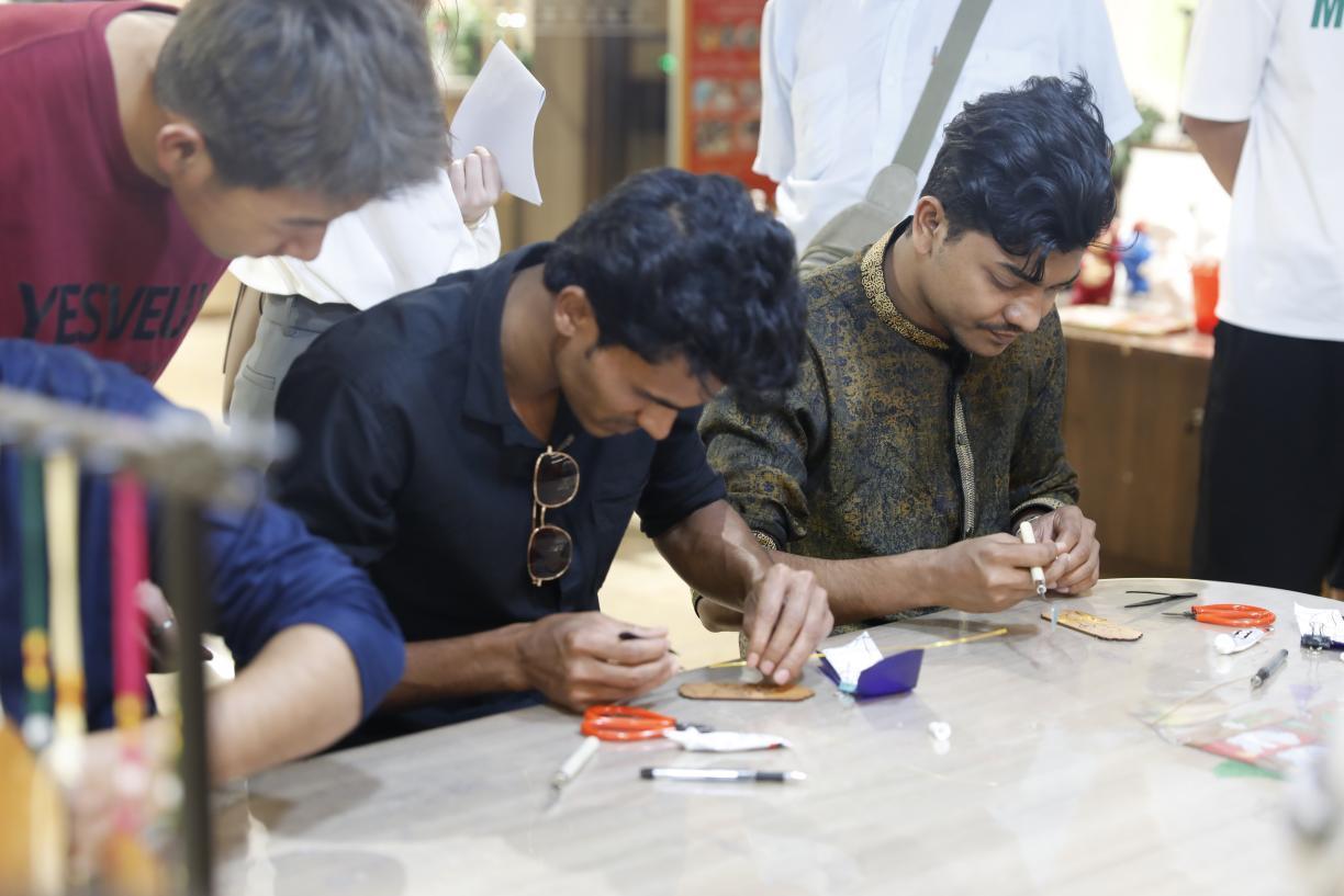 掐絲琺瑯是最具中國特色的傳統(tǒng)手工藝品之一,在老師的帶領(lǐng)下,外籍師生體驗(yàn)了涂膠、掐絲、調(diào)沙、固沙、風(fēng)干等環(huán)節(jié)。“這真的太精彩了,掐絲琺瑯給我?guī)砹朔浅S腥さ捏w驗(yàn)。”來自巴基斯坦的外籍教師阿潤(rùn)激動(dòng)地說道。