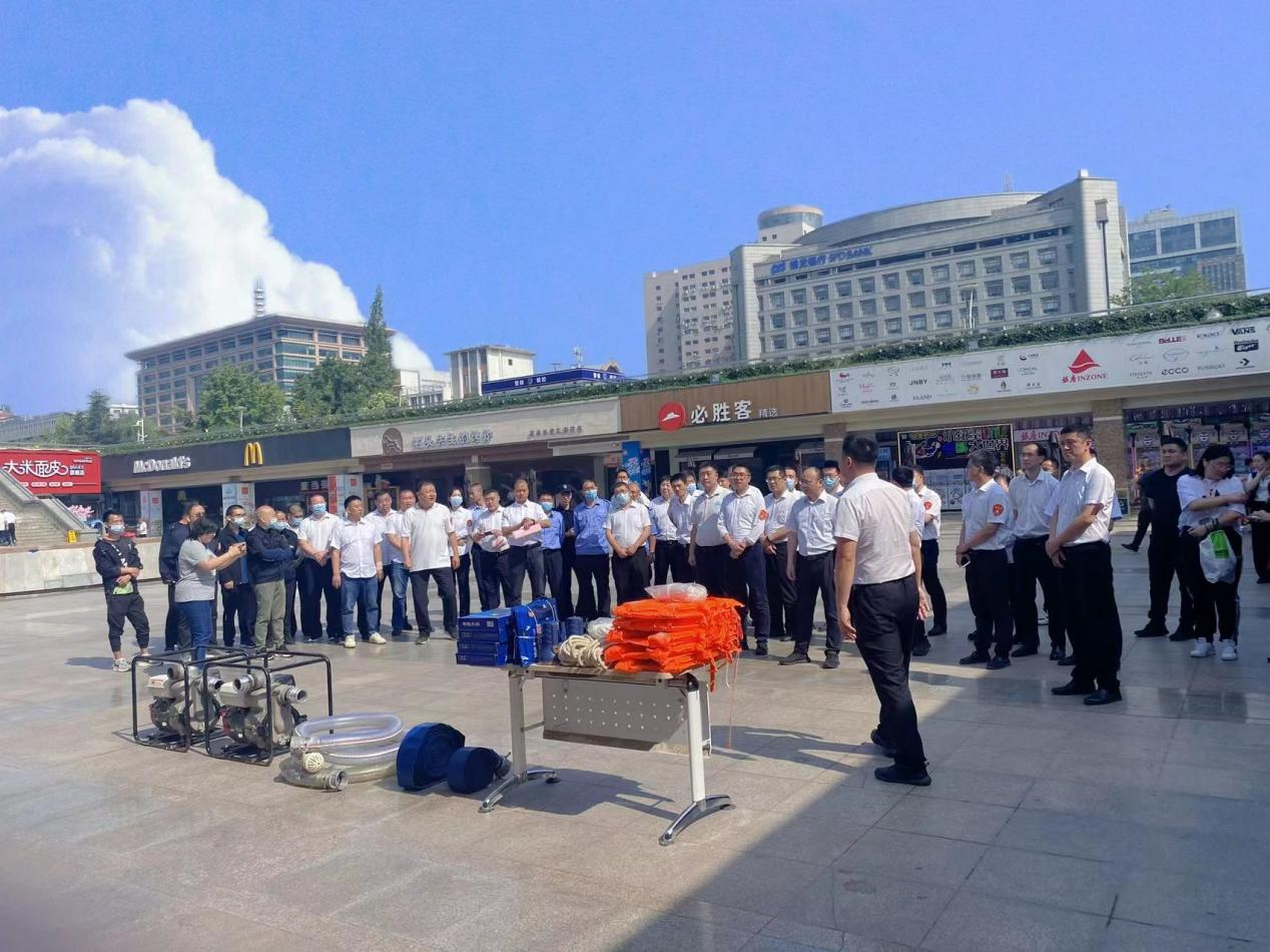 銀座廣場店負責人從牢固樹立安全發展理念、做安全知識的傳播者并熟練掌握安全應急技能、切實增強風險防范意識向公司各單位發出倡議。廣場店安全隊員針對汛情開展應急處置演練并介紹相關經驗。