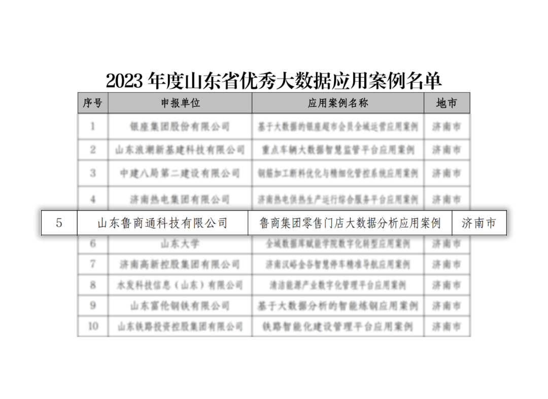 近日,山東省工信廳公布《2023年度大數據“三優兩重”項目名單》,魯商科技及所屬魯商通科技有限公司雙雙榮獲“山東省重點數廠”稱號,“魯商集團零售門店大數據分析應用案例”獲評山東省優秀大數據應用案例。