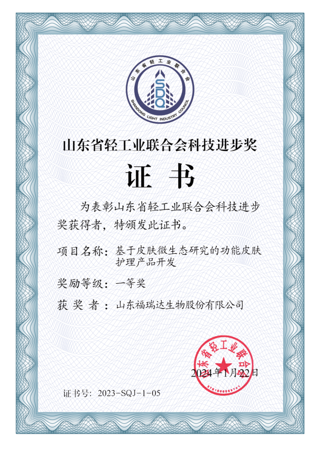 近日,省輕工業(yè)聯(lián)合會(huì)發(fā)布《關(guān)于2023年度山東省輕工業(yè)聯(lián)合會(huì)科學(xué)技術(shù)獎(jiǎng)勵(lì)的決定》,福瑞達(dá)生物申報(bào)的“基于皮膚微生態(tài)研究的功能皮膚護(hù)理產(chǎn)品開發(fā)”“薰衣草精油抗炎、助眠機(jī)制研究與功能性護(hù)理品產(chǎn)業(yè)化”兩個(gè)項(xiàng)目榮獲2023年度山東省輕工業(yè)聯(lián)合會(huì)科技進(jìn)步獎(jiǎng)一等獎(jiǎng)。