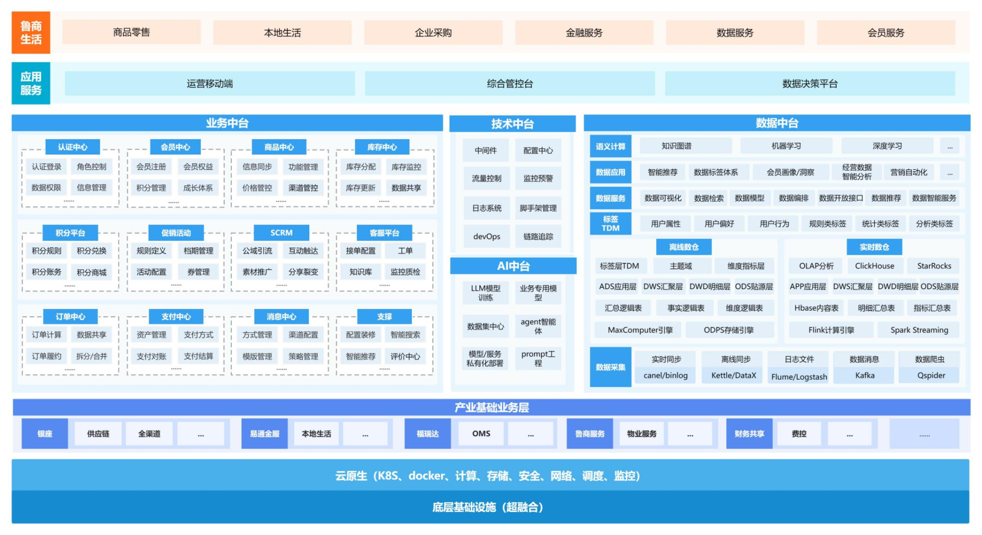 為推動魯商集團(tuán)業(yè)務(wù)發(fā)展,通過對混合云平臺、業(yè)務(wù)中臺、數(shù)據(jù)中臺、技術(shù)中臺的建設(shè),結(jié)合Uni-app、大數(shù)據(jù)OLAP、容器化服務(wù)網(wǎng)格等前后臺技術(shù)手段,全面賦能集團(tuán)及產(chǎn)業(yè)數(shù)字化轉(zhuǎn)型。