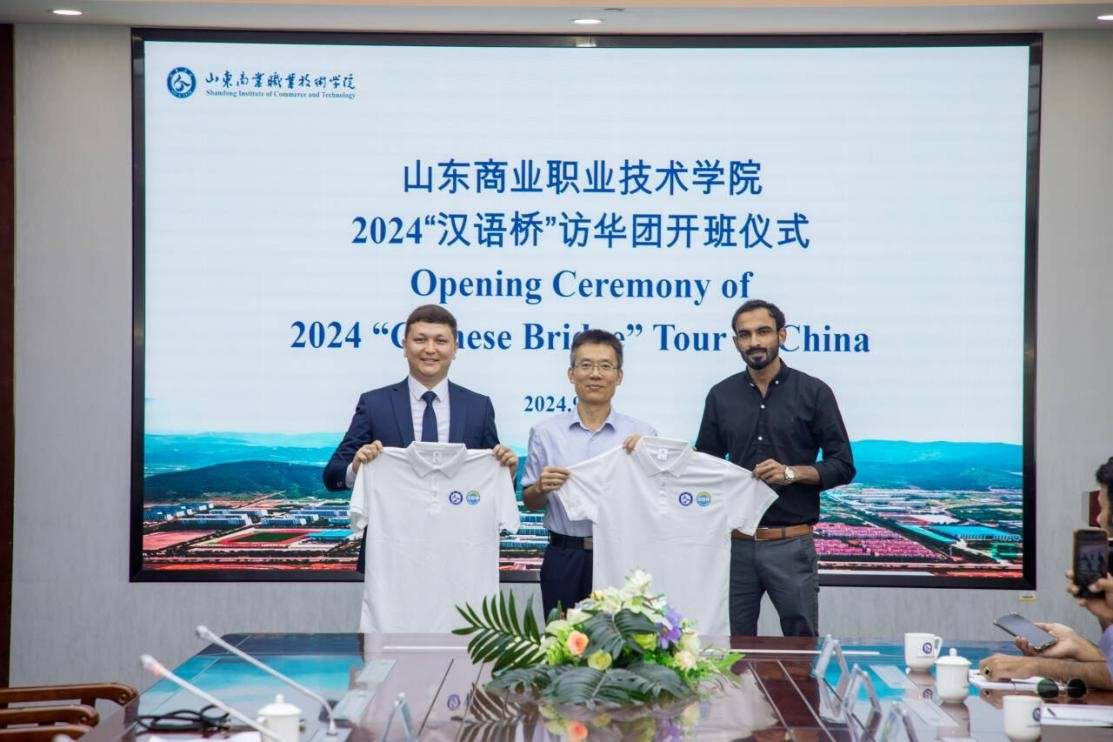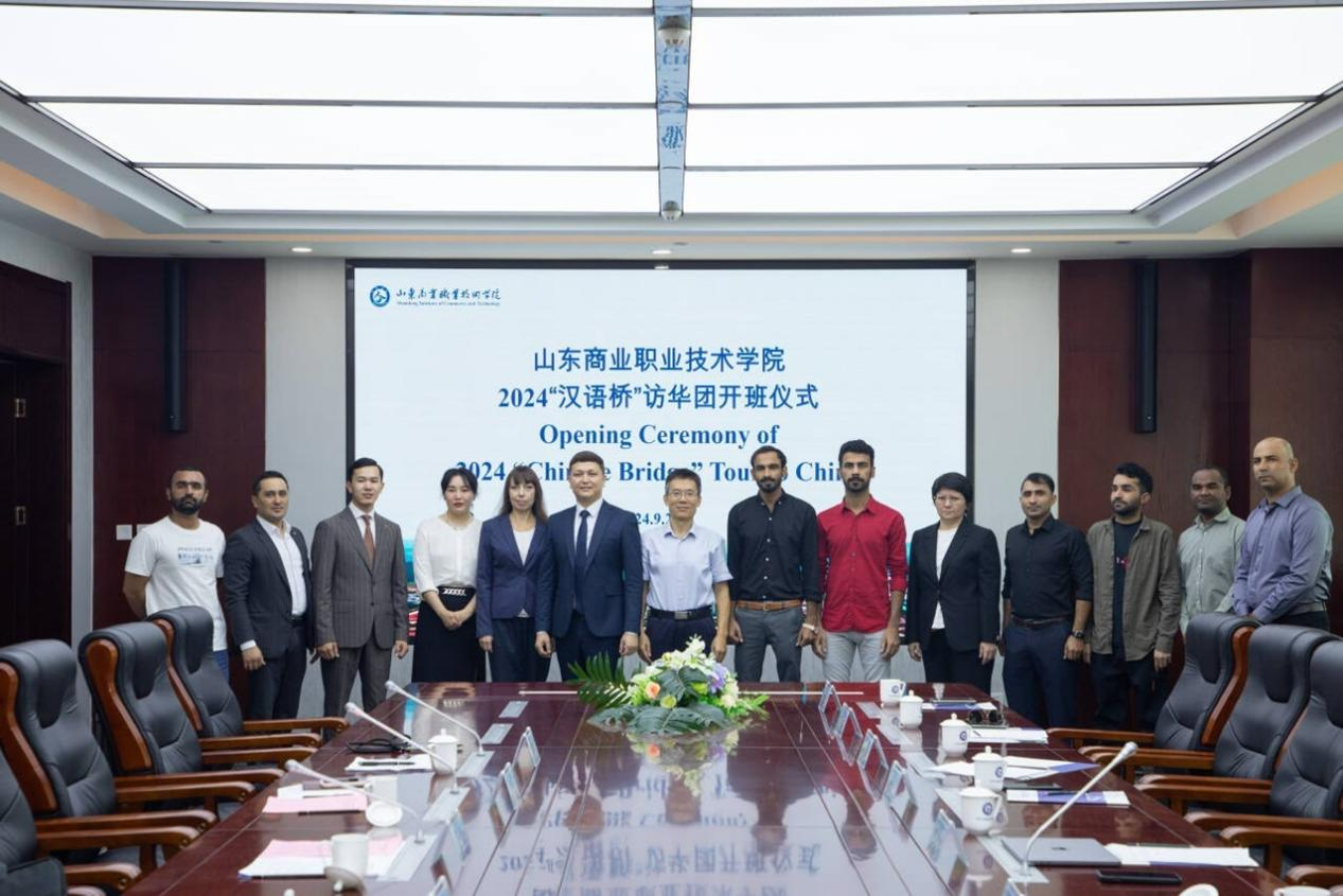 近日,由教育部中外語言交流合作中心主辦、山東商職學院承辦的2024“漢語橋”訪華團開班儀式在山東商職學院舉行。烏茲別克斯坦國際農業(yè)大學農業(yè)科技與商業(yè)學院院長阿里莫夫·賈洪吉爾一行5人、巴基斯坦-中國職業(yè)技術學院7名教育工作者參加開班儀式。