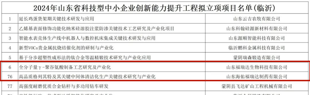 近日,福瑞達(dá)旗下福瑞達(dá)生物科技與海佑福瑞達(dá)兩家公司申報(bào)的“全分子量γ-聚谷氨酸制備工藝研究及產(chǎn)業(yè)化”和“高品質(zhì)格列齊特及其關(guān)鍵中間體清潔化生產(chǎn)關(guān)鍵技術(shù)研究與產(chǎn)業(yè)化”兩項(xiàng)目成功獲得2024年省科技型中小企業(yè)創(chuàng)新能力提升工程立項(xiàng)。