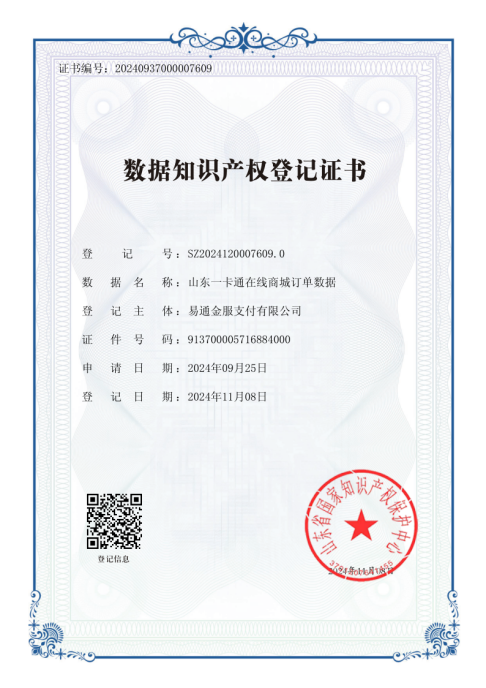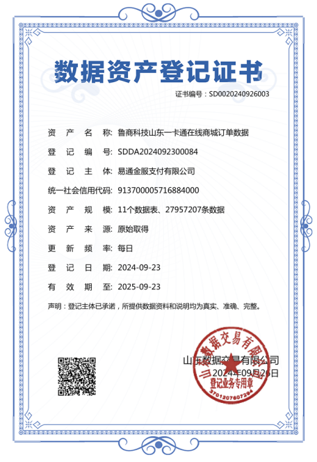 本次入表的“山東一卡通在線商城訂單數(shù)據(jù)”基于公司權(quán)屬單位易通金服沉淀的海量平臺運(yùn)營數(shù)據(jù),魯商科技通過深度清洗加工、合規(guī)確權(quán)、質(zhì)量評價(jià)等,形成高質(zhì)量數(shù)據(jù)集,并順利獲得數(shù)據(jù)資源、數(shù)據(jù)資產(chǎn)、數(shù)據(jù)知識產(chǎn)權(quán)3類登記證書。