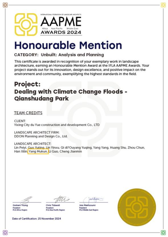 近日,國際風景園林師聯合會(IFLA)正式公布IFLA AAPME Awards 2024國際風景園林師聯合會亞太景觀設計獎獲獎名單,青島酒店管理職院教師楊牧昆主持的宜興錢墅蕩公園項目榮獲分析與規劃類銅獎。