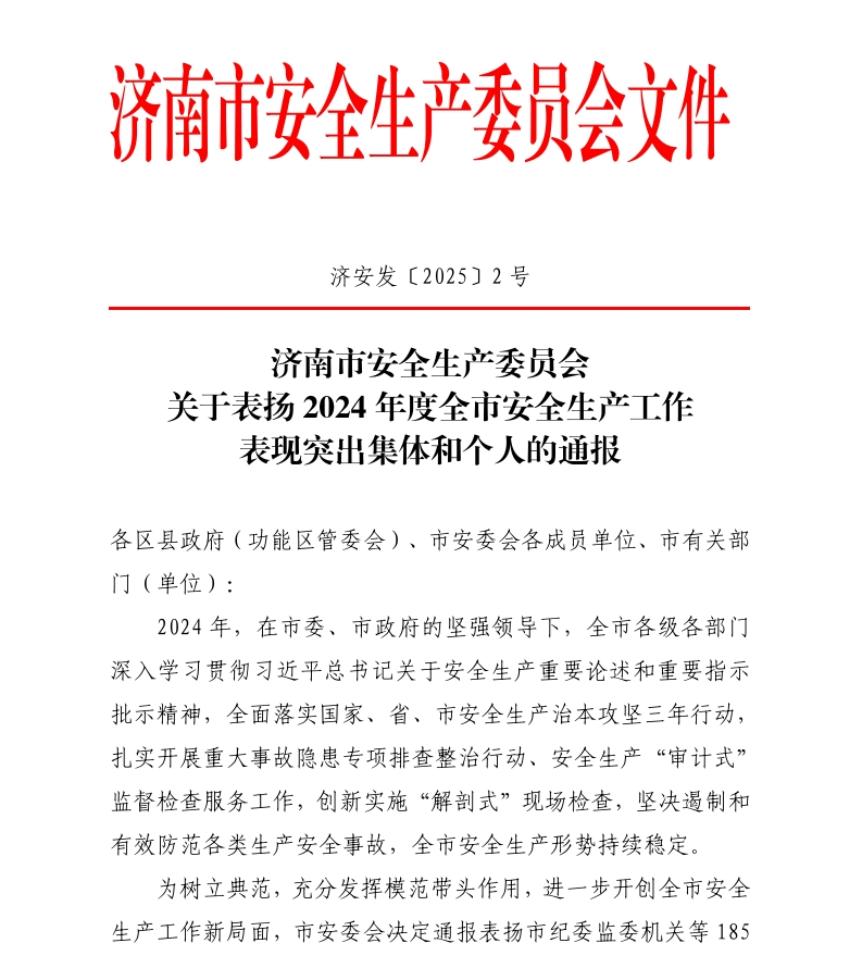 3月3日,濟南市安全生產委員會下發《關于表揚2024年度全市安全生產表現突出的集體和個人的通報》,對2024年度全市安全生產工作表現突出集體和個人予以通報表揚,魯商產投所屬濟南魯商福瑞達護理院榮獲“2024年度濟南市安全生產工作企事業單位表現突出集體”稱號,是全市唯一一家上榜護理院(養老機構)。