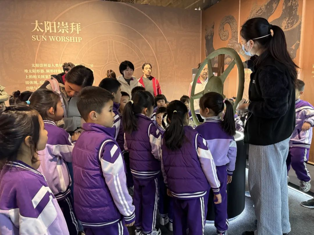 在展館的文物展覽區(qū),孩子們近距離觀賞了黃金面具、青銅神壇、青銅人首鳥身像等三星堆館藏文物的精美復(fù)刻品。講解老師用生動(dòng)有趣的語言,為孩子們打開了一扇通往古蜀文化世界的神秘大門,讓他們身臨其境地感受到了三星堆古蜀文化的深厚底蘊(yùn)與獨(dú)特魅力。