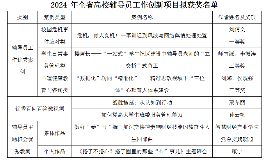 近日,山東省教育廳公布了全省高校輔導(dǎo)員工作創(chuàng)新項目評選結(jié)果,經(jīng)組織推薦、資格審核、專家遴選等程序,山東商職學(xué)院獲評2024年輔導(dǎo)員工作優(yōu)秀案例一等獎1項、三等獎2項,優(yōu)秀百問百答微視頻獲獎2項,輔導(dǎo)員主題班會優(yōu)秀教案集體作品和個人作品各1項。