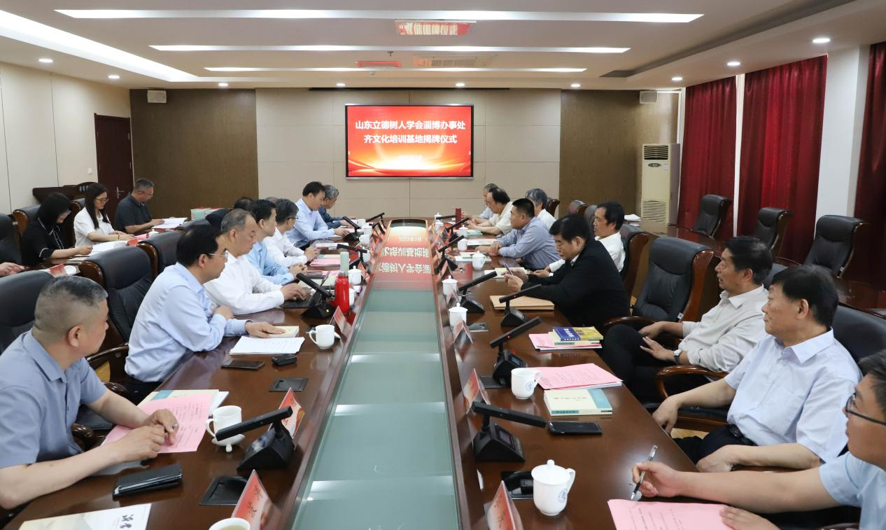 與會人員為山東立德樹人學會淄博辦事處、齊文化培訓基地揭牌,山東省沂蒙文化研究會向齊魯醫藥學院、山東理工大學捐贈了《樂群記》等圖書資料。